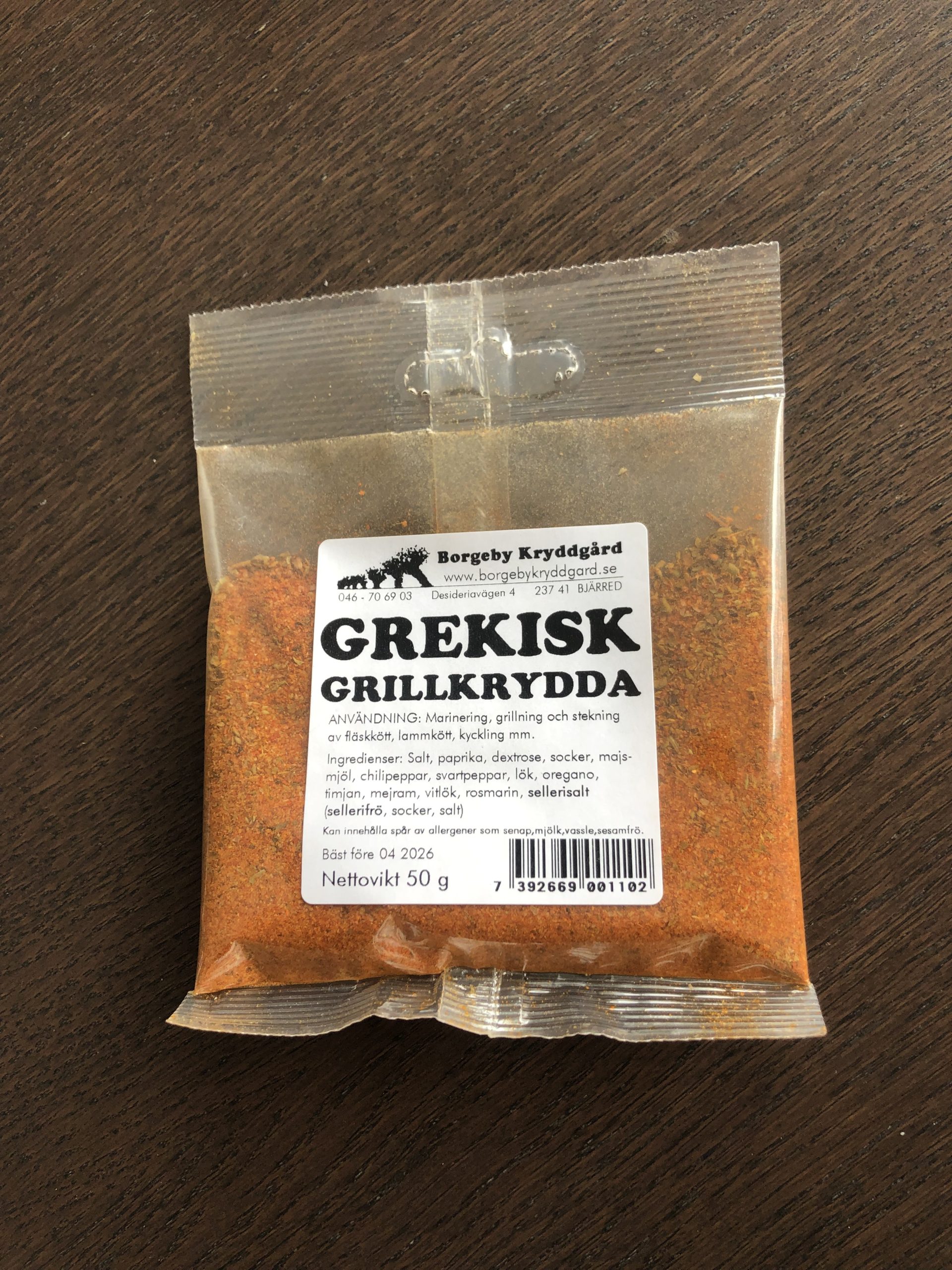 Ingredienser: salt, paprika, dextrose, socker, majsmjöl, chilipeppar, svartpeppar, lök, oregano, timjan, mejram, vitlök, rosmarin, selerisalt